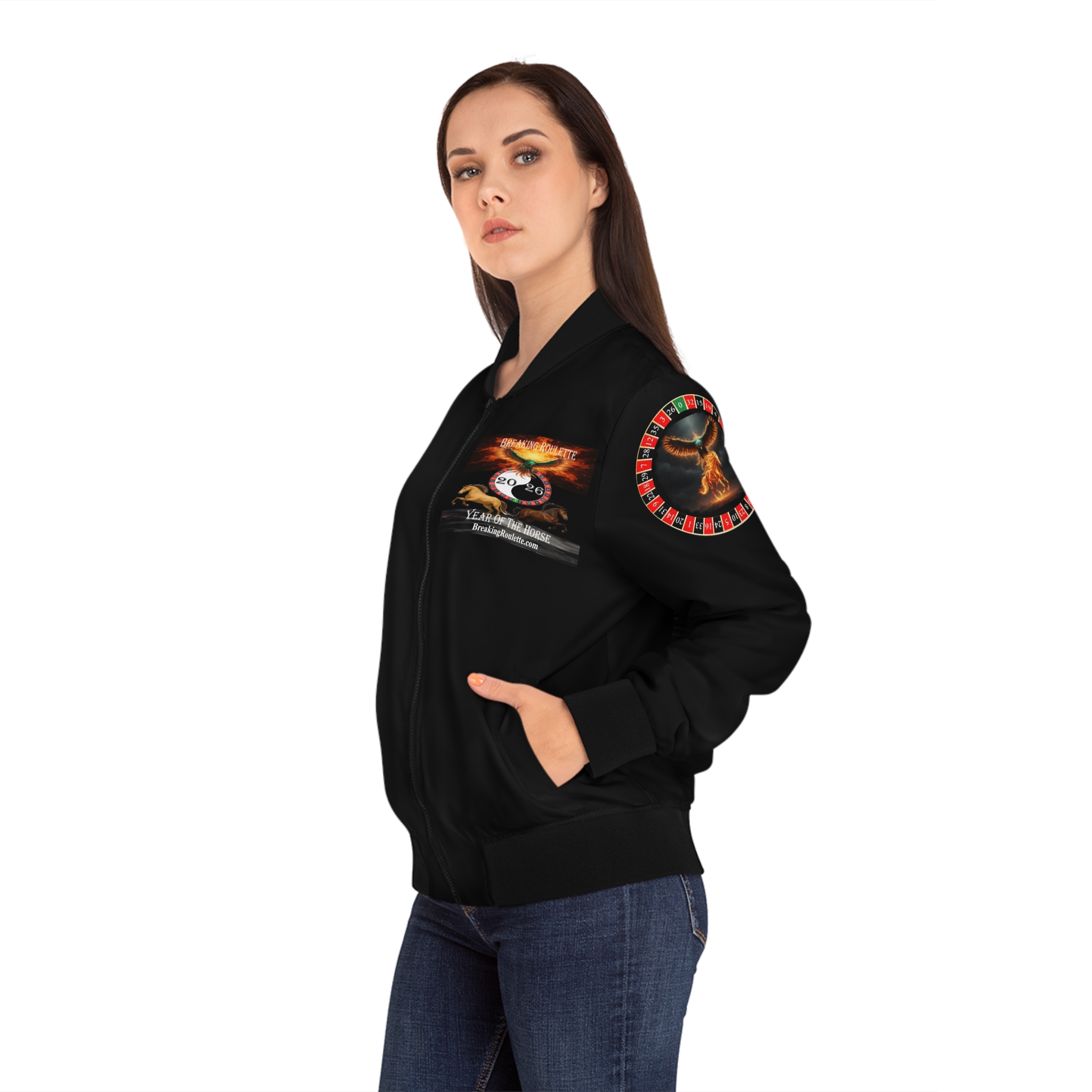 Stay cozy and stylish in this 2026 Year of the Horse Zip Up bomber jacket by Breaking Roulette. Breaking Roulette salutes the Year of the Horse and all those born under this sign of the Chinese zodiac. Perfect for those who appreciate comfort and unique designs. Ideal for those looking to stand out during casual outings or cozy nights in.